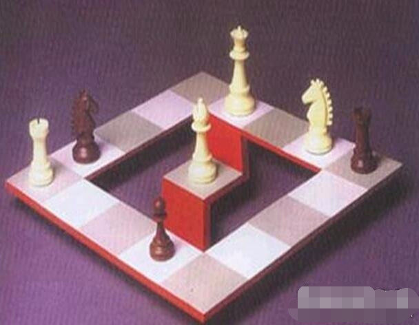 这是一幅棋盘,但是仔细观察你会发现它本身是一个不可能图形。如果用手遮住中间挖空的部分和中间的棋子,你会发现棋盘是在一个平面上的。但是如果挪开手,你就会发现,图片右上部要比图片左下部的棋盘要高。