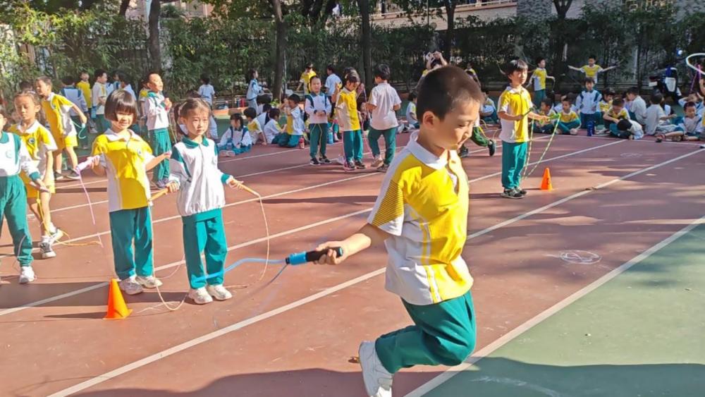 场上一、二年级的小豆丁们虽小,却不甘示弱,一条条跳绳在空中舞出了风声。他们仿佛是欢快的精灵,在绳影斑驳中跳跃,每一个动作都如同一支自由飞翔的舞蹈,无拘无束,充满童真。
