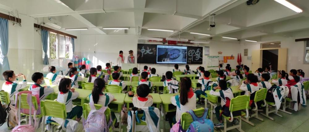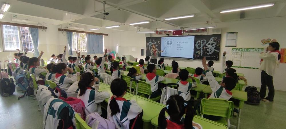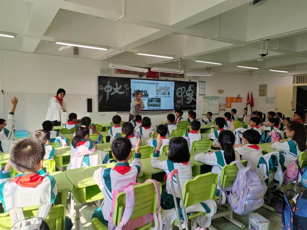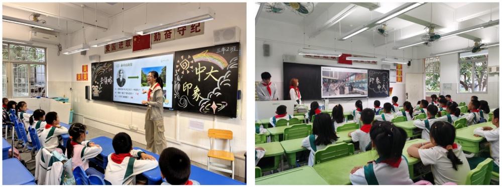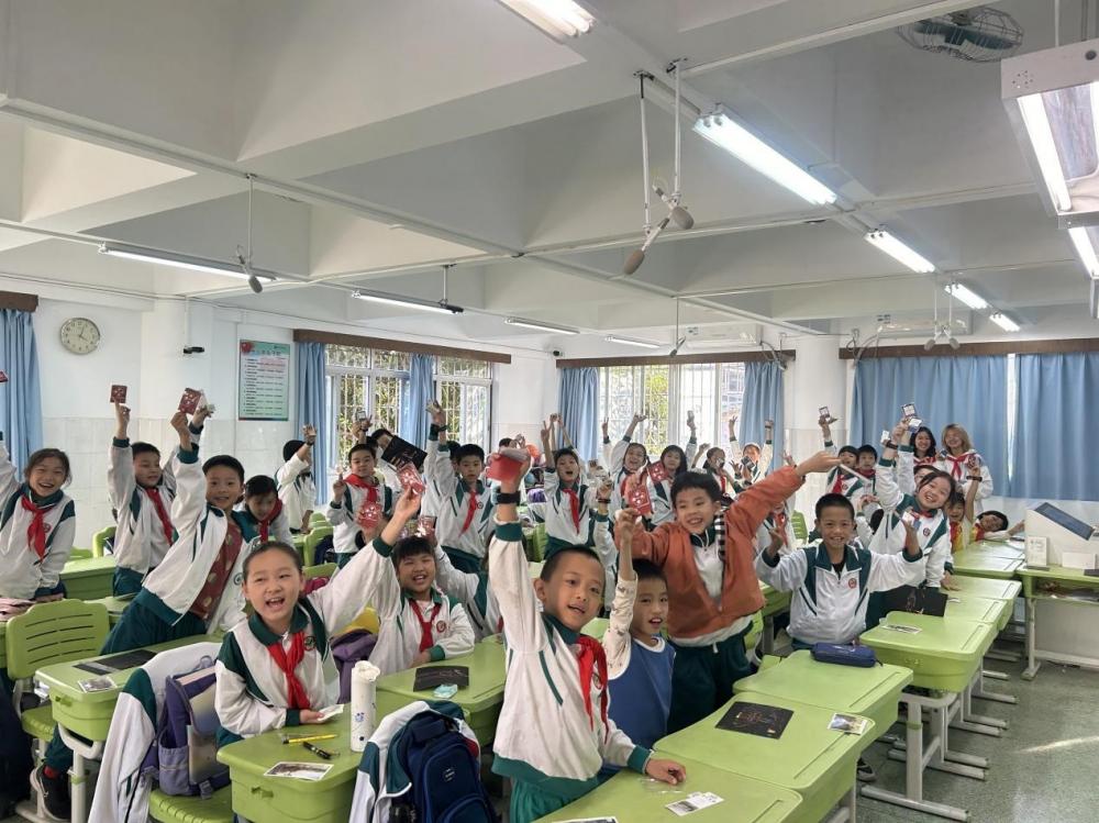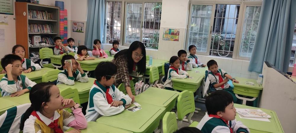 有心的志愿者老师们不仅带来了中大历史、中大精神,还为三年级的孩子们设计了丰富有趣的活动:给孩子们分发中山大学的校徽贴纸、在问答题互动环节送上精美的中大印象明信片、赠送中大印象小日历……
