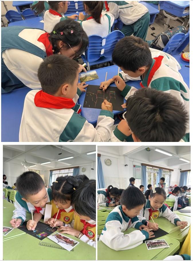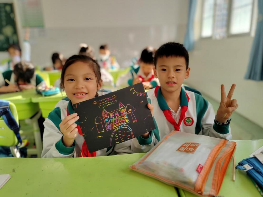 孩子们手执木笔,在画纸上画下了自己心中的中大。牌坊、铜像、楼栋……中大就这样一点一点跃然纸上,比照片更童趣,比记忆更鲜活!