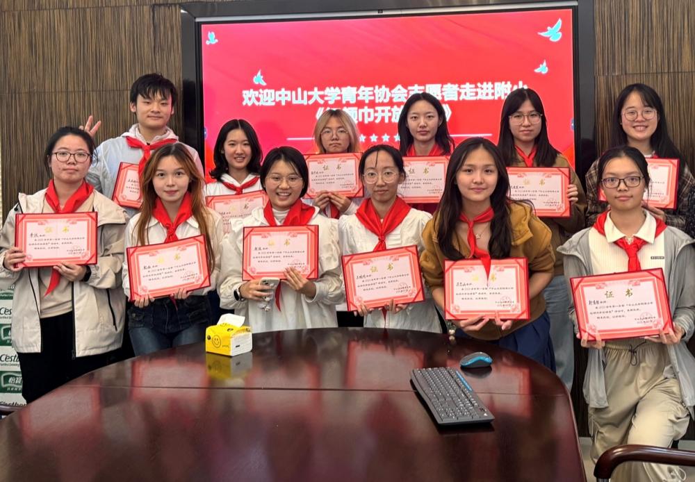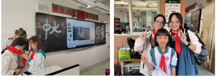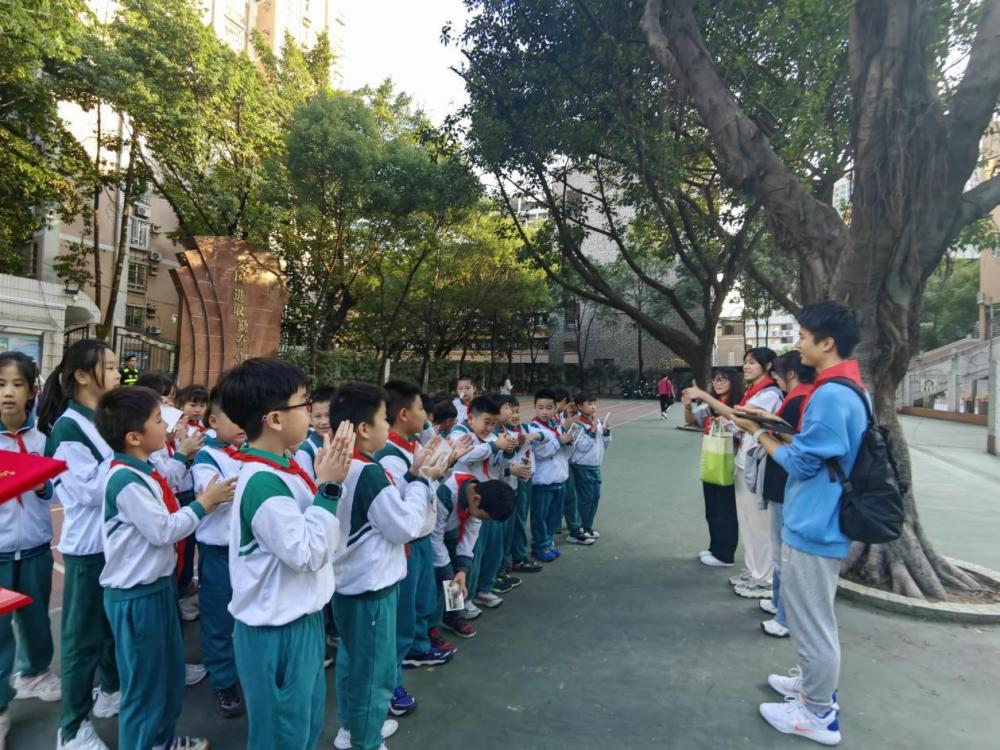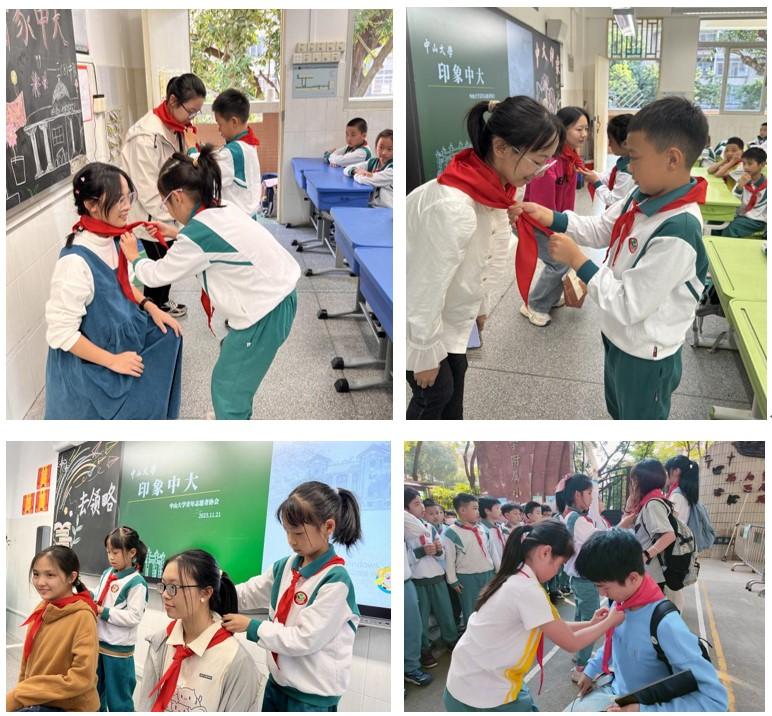 活动开始前,各中队优秀少先队员代表为中大的志愿者们郑重地戴上了红领巾。在孩子们热烈的掌声中,活动正式开始。