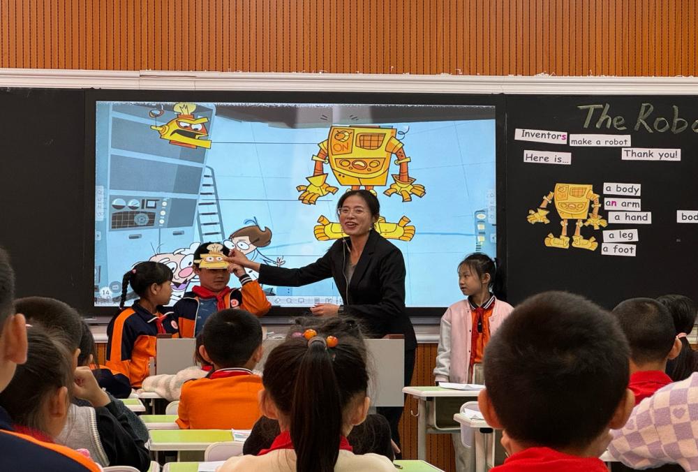 英语学科米成飞老师为梅实小学三年级学生开展了一堂生动有趣的绘本教学课。结合学生特点,她选择了适合学生年龄段和语言积累的绘本—大猫分级阅读一级 The Robot。在本堂课中,米老师结合了颜色和身体部位两个语言点,重点强调here is…的句型输出。语言学习注重知识的不断滚动重复,通过新旧知识结合的方式帮助学生巩固基础,并进行语言的综合输出。米老师运用游戏、表演、肢体参与等多种方式进行综合教学并充分利用图片信息,进行深度挖掘,引导学生观察图片,发展学生的观察能力,并通过设问等方式引导学生帮助绘本主人公解决问题,发展学生思维能力。