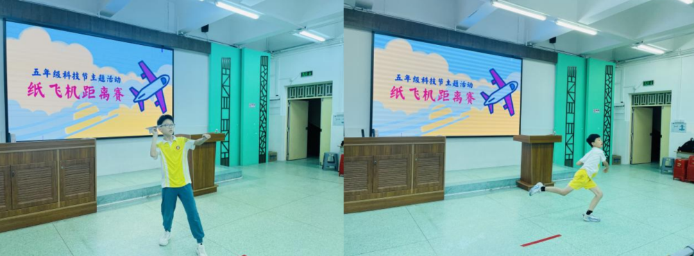 五年级学生通过自行研发的各式纸飞机模型,向大家展示了他们的纸飞机究竟能飞多远。“放飞梦想,星辰大海”,孩子们放飞的不仅是小小的纸飞机,也是他们心目大大的理想。